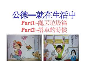 低年級 ◎觀察小日記 1. 教師引導學生觀賞繪本進行討論。 2. 教師請學生發表生活中類似的事件。 3. 請學生觀察生活中類似事件,並寫成小日記。 中年級 ◎公德心漫畫繪製 1. 教師引導學生思考「公德心」真正的意義。 2. 教師引導學生製作以『公德心』為主題的四格漫畫。 3. 教師引導學生討論與分享彼此的作品。 高年級 ◎小小導護員 1. 教師引導學生分組成立校園導護小組。 2. 教師請學生分享各組早上到校之後巡視各樓層的狀況。 3. 教師引導學生將各種狀況記錄下來。 4. 教師引導各組學生在狀況後面加一欄位,寫出各種具體的建議。 |